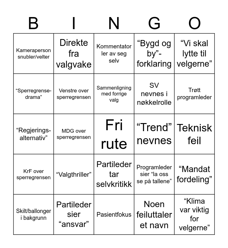 This bingo card has a free space and 24 words: “Valgthriller”, Partileder sier “ansvar”, Sammenligning med forrige valg, Skilt/ballonger i bakgrunn, “Vi skal lytte til velgerne”, Kameraperson snubler/velter, “Sperregrense-drama”, Direkte fra valgvake, “Trend” nevnes, Partileder tar selvkritikk, SV nevnes i nøkkelrolle, “Regjerings-alternativ”, Programleder sier “la oss se på tallene”, “Mandat fordeling”, Venstre over sperregrensen, Noen feiluttaler et navn, Teknisk feil, Kommentator ler av seg selv, Trøtt programleder, MDG over sperregrensen, “Klima var viktig for velgerne”, KrF over sperregrensen, “Bygd og by”-forklaring and Pasientfokus.