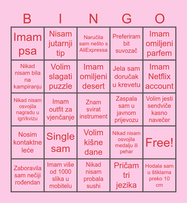 This bingo card has 26 words: Volim kišne dane, Pričam tri jezika, Imam omiljeni desert, Imam više od 1000 slika u mobitelu, Imam omiljeni parfem, Imam psa, Nikad nisam bila na kampiranju, Nisam jutarnji tip, Volim jesti sendviče kasno navečer, Nikad nisam osvojila medalju ili pehar, Jela sam doručak u krevetu, Nikad nisam osvojila nagradu u igri/kvizu, Free!, Zaboravila sam nečiji rođendan, Imam outfit za vjenčanje, Pušim cigarete, Preferiram bit suvozač, Nosim kontaktne leće, Naručila sam nešto s AliExpressa, Znam svirat instrument, Imam Netflix account, Nikad nisam probala sushi, Zaspala sam u javnom prijevozu, Single sam, Volim slagati puzzle and Hodala sam u štiklama preko 10 cm.