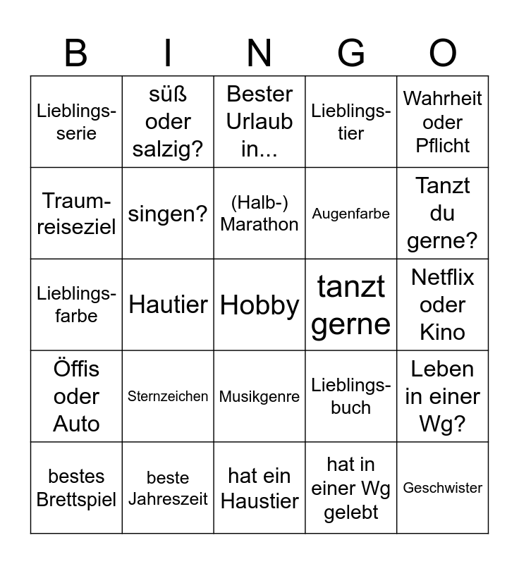 This bingo card has 25 words: Öffis oder Auto, beste Jahreszeit, Hobby, hat in einer Wg gelebt, Wahrheit oder Pflicht, Lieblings-serie, süß oder salzig?, Bester Urlaub in..., tanzt gerne, Leben in einer Wg?, Traum-reiseziel, singen?, hat ein Haustier, Lieblings-buch, Tanzt du gerne?, bestes Brettspiel, Hautier, (Halb-) Marathon, Augenfarbe, Netflix oder Kino, Lieblings-farbe, Sternzeichen, Musikgenre, Lieblings-tier and Geschwister.