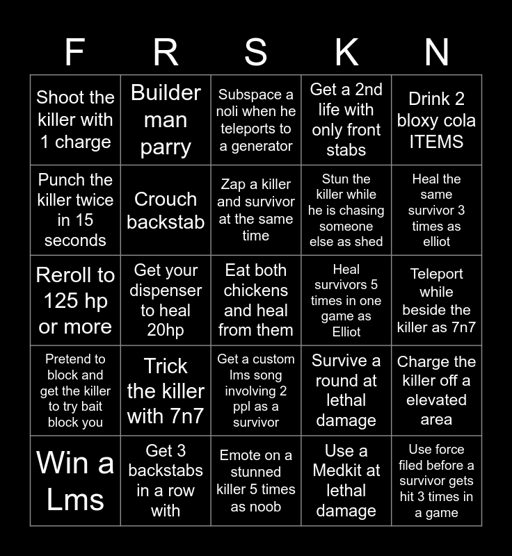 This bingo card has a free space and 24 words: Trick the killer with 7n7, Get 3 backstabs in a row with, Zap a killer and survivor at the same time, Win a Lms, Drink 2 bloxy cola ITEMS, Shoot the killer with 1 charge, Punch the killer twice in 15 seconds, Builder man parry, Heal survivors 5 times in one game as Elliot, Get a custom lms song involving 2 ppl as a survivor, Stun the killer while he is chasing someone else as shed, Reroll to 125 hp or more, Survive a round at lethal damage, Charge the killer off a elevated area, Crouch backstab, Use a Medkit at lethal damage, Teleport while beside the killer as 7n7, Subspace a noli when he teleports to a generator, Heal the same survivor 3 times as elliot, Get your dispenser to heal 20hp, Use force filed before a survivor gets hit 3 times in a game, Pretend to block and get the killer to try bait block you, Get a 2nd life with only front stabs and Emote on a stunned killer 5 times as noob.