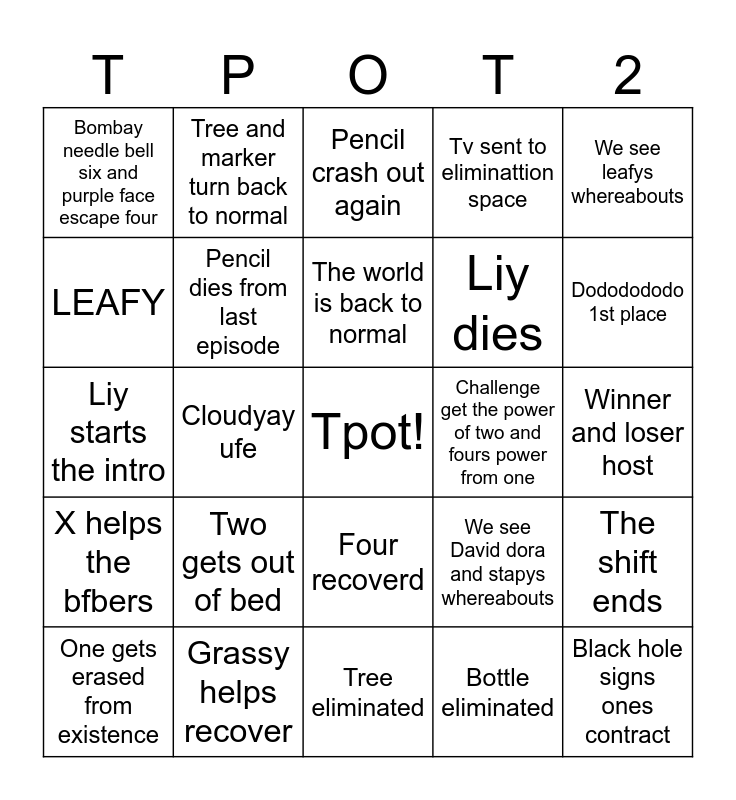 This bingo card has a free space and 29 words: One gets erased from existence, Basketball barf bag and gaty come back, Cloudyay ufe, Team 2 ufe, Bombay needle bell six and purple face escape four, Pencil crash out again, Pencil dies from last episode, Two gets out of bed, Challenge get the power of two and fours power from one, Grassy helps recover, Winner and loser host, Black hole signs ones contract, Tree eliminated, Bottle eliminated, Dododododo 1st place, Death pact yet again 2nd, Four recoverd, X helps the bfbers, We see leafys whereabouts, Liy starts the intro, We see David dora and stapys whereabouts, Rejoin, Liy dies, LEAFY, Tv sent to eliminattion space, Tree and marker turn back to normal, The shift ends, The world is back to normal and Loser first line.
