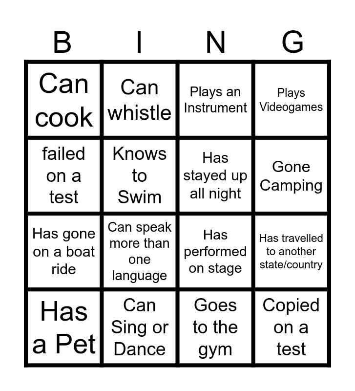 This bingo card has 17 words: Goes to the gym, Has a Pet, Plays an Instrument, Can cook, Can speak more than one language, Plays Videogames, Has travelled to another state/country, Has stayed up all night, Gone Camping, Knows to Swim, Can Sing or Dance, Has performed on stage, failed on a test, Can whistle, Has gone on a boat ride, Broken a Bone and Copied on a test.