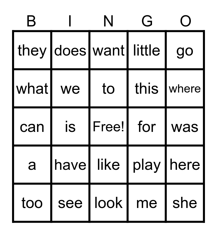 This bingo card has a free space and 40 words: I, can, the, we, see, like, to, and, go, a, is, little, she, was, for, have, of, they, said, want, here, me, this, what, you, do, my, are, with, he, help, too, has, play, where, look, who, come, does and good.
