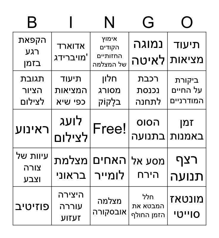 This bingo card has a free space and 25 words: מצלמת בראוני, מצלמה אובסקורה, חלון מסורג בלָקוֹק, פוזיטיב, תיעוד מציאות, הקפאת רגע בזמן, תגובת הציור לצילום, אדוארד מויברידג', הסוס בתנועה, האחים לומייר, רכבת נכנסת לתחנה, ראינוע, מסע אל הירח, רצף תנועה, תיעוד המציאות כפי שיא, צבעוניות, זמן באמנות, אימוץ הקודים החזותיים של המצלמה, ביקורת על החיים המודרניים, לועג לצילום, מונטאז סוייטי, היצירה עוררה זעזוע, עיוות של צורה וצבע, נמוגה לאיטה and חלל המבטא את הזמן החולף.