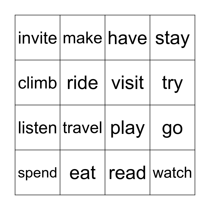 This bingo card has 16 words: eat, go, have, invite, listen, make, play, read, climb, ride, spend, stay, travel, try, visit and watch.