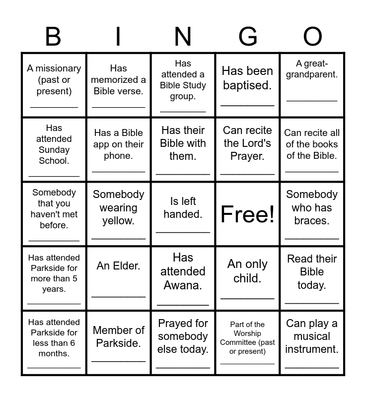 This bingo card has 28 words: Read their Bible today. _________, Has attended Bible Camp. __________, Can recite the Lord's Prayer. _________, Part of the Worship Committee (past or present) _____________, Has attended Sunday School. __________, Has attended a Bible Study group. _________, Has memorized a Bible verse. __________, Has attended Parkside for more than 5 years. ___________, Free!, Has attended Parkside for less than 6 months. ___________, Somebody that you haven't met before. __________, Has been baptised. ________, Member of Parkside. _________, Prayed for somebody else today. _________, Can recite all of the books of the Bible. __________, A deacon. ________, An Elder. _________, Has a Bible app on their phone. __________, Has their Bible with them. _________, Has attended Awana. ________, A missionary (past or present) _________, Can play a musical instrument. _________, Is left handed. _________, Somebody wearing yellow. _________, Somebody who has braces. _________, An only child. ________, A great-grandparent. __________ and Read their Bible today. _________.