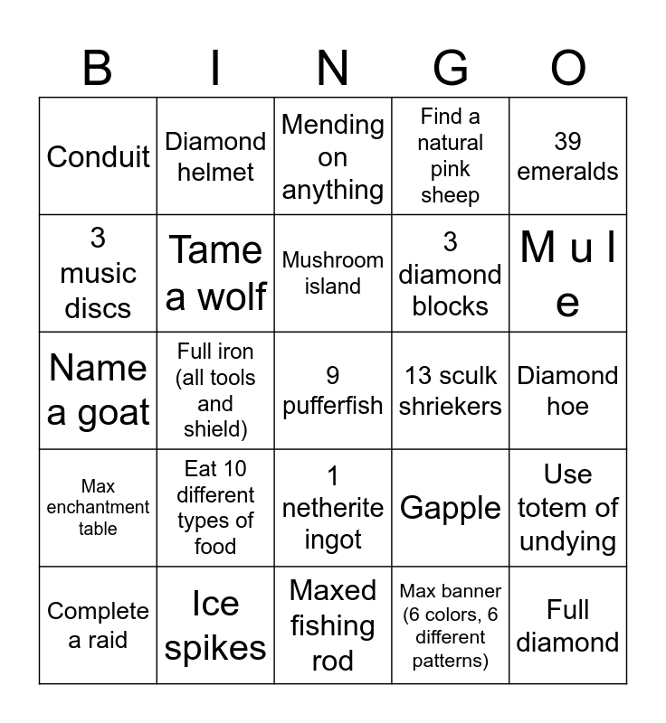 This bingo card has 25 words: Eat 10 different types of food, Maxed fishing rod, Mushroom island, Complete a raid, 39 emeralds, Conduit, 3 music discs, Diamond helmet, 13 sculk shriekers, 1 netherite ingot, 3 diamond blocks, Name a goat, Gapple, Use totem of undying, Tame a wolf, Full diamond, Diamond hoe, Mending on anything, M u l e, Full iron (all tools and shield), 9 pufferfish, Ice spikes, Max enchantment table, Find a natural pink sheep and Max banner (6 colors, 6 different patterns).