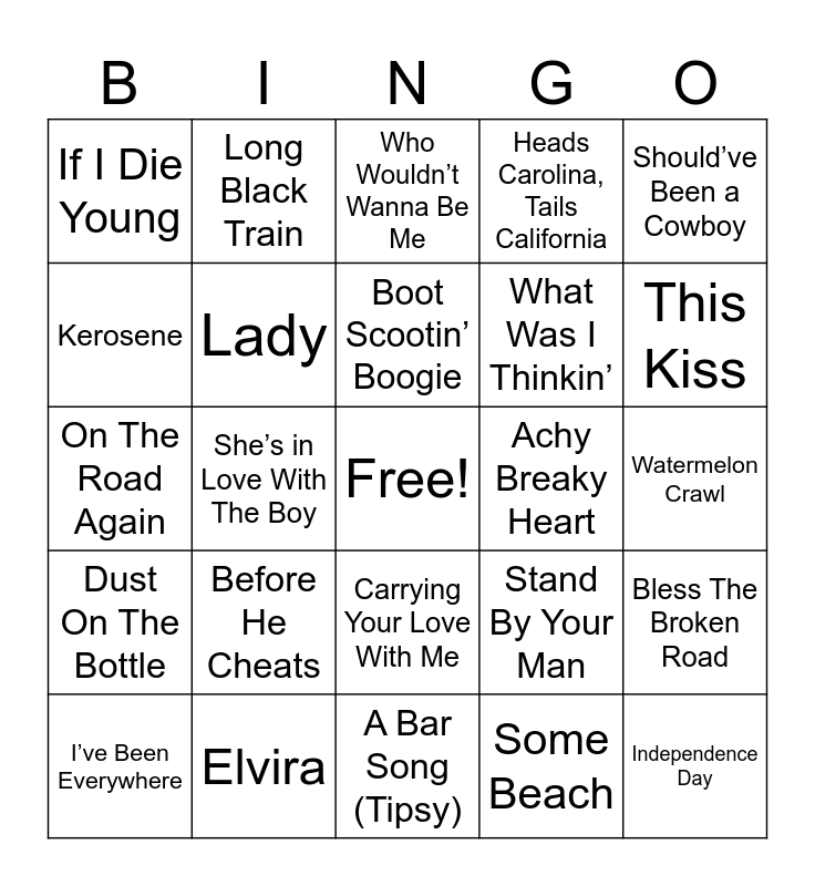 This bingo card has a free space and 40 words: Forever and Ever, Amen, On The Road Again, 9 to 5, Lady, Elvira, Carrying Your Love With Me, Boot Scootin’ Boogie, Friends in Low Places, Should’ve Been a Cowboy, Dust On The Bottle, She’s in Love With The Boy, Heads Carolina, Tails California, Independence Day, Watermelon Crawl, Achy Breaky Heart, Before He Cheats, Dirt Road Anthem, If I Die Young, Need You Now, Who Wouldn’t Wanna Be Me, Bless The Broken Road, Some Beach, What Was I Thinkin’, Kerosene, Redneck Woman, The Devil Went Down to Georgia, Mama Tried, You Never Even Called Me by My Name, Remember When, Song of the South, Walkin’ After Midnight, I’ve Been Everywhere, My Front Porch Looking In, Stand By Your Man, This Kiss, A Bar Song (Tipsy), Amarillo By Morning, Where I Come From, Long Black Train and Honky Tonk Badonkadonk.