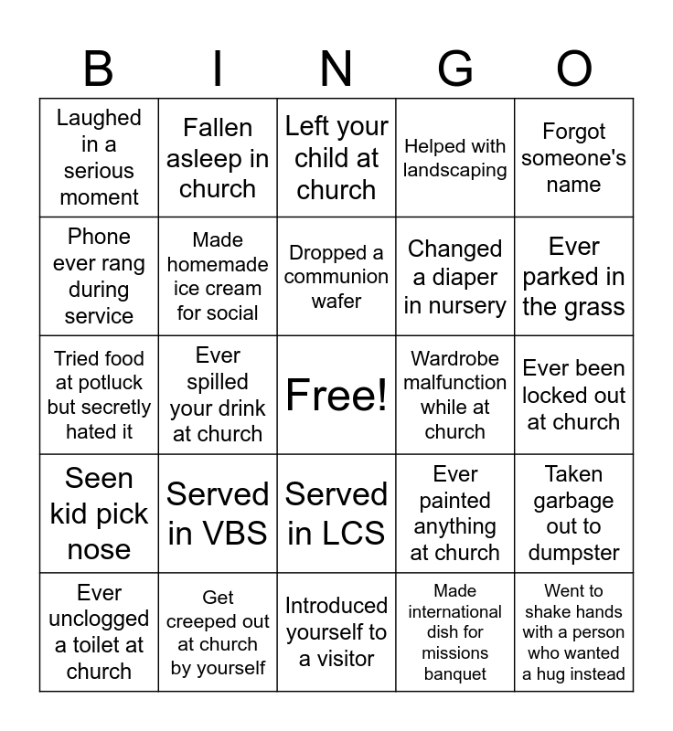 This bingo card has a free space and 24 words: Served in VBS, Get creeped out at church by yourself, Dropped a communion wafer, Ever unclogged a toilet at church, Forgot someone's name, Laughed in a serious moment, Phone ever rang during service, Fallen asleep in church, Wardrobe malfunction while at church, Served in LCS, Changed a diaper in nursery, Tried food at potluck but secretly hated it, Ever painted anything at church, Taken garbage out to dumpster, Made homemade ice cream for social, Made international dish for missions banquet, Ever been locked out at church, Left your child at church, Ever parked in the grass, Ever spilled your drink at church, Went to shake hands with a person who wanted a hug instead, Seen kid pick nose, Helped with landscaping and Introduced yourself to a visitor.