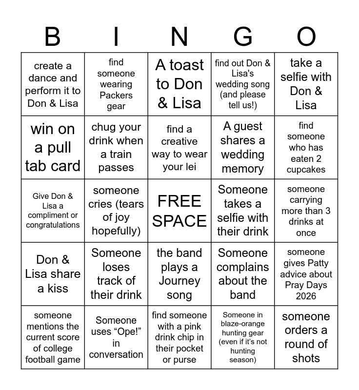 This bingo card has a free space and 24 words: Someone loses track of their drink, Someone uses “Ope!” in conversation, find a creative way to wear your lei, someone mentions the current score of college football game, take a selfie with Don & Lisa, create a dance and perform it to Don & Lisa, win on a pull tab card, find someone wearing Packers gear, Someone takes a selfie with their drink, the band plays a Journey song, A guest shares a wedding memory, Give Don & Lisa a compliment or congratulations, Someone complains about the band, someone gives Patty advice about Pray Days 2026, chug your drink when a train passes, Someone in blaze-orange hunting gear (even if it’s not hunting season), someone carrying more than 3 drinks at once, A toast to Don & Lisa, find someone who has eaten 2 cupcakes, someone cries (tears of joy hopefully), someone orders a round of shots, Don & Lisa share a kiss, find out Don & Lisa's wedding song (and please tell us!) and find someone with a pink drink chip in their pocket or purse.