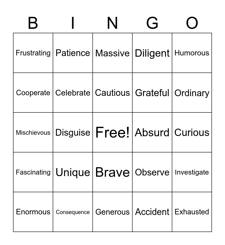 This bingo card has a free space and 25 words: Unique, Generous, Cautious, Enormous, Humorous, Frustrating, Cooperate, Patience, Absurd, Brave, Grateful, Mischievous, Observe, Investigate, Celebrate, Imagine, Curious, Massive, Ordinary, Disguise, Exhausted, Consequence, Fascinating, Diligent and Accident.