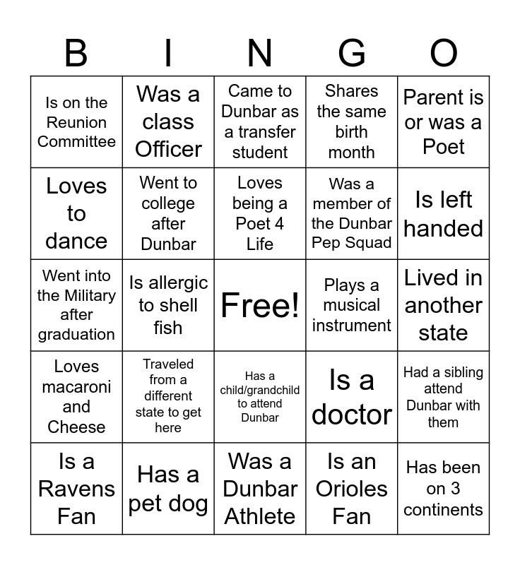 This bingo card has a free space and 24 words: Traveled from a different state to get here, Has a pet dog, Loves being a Poet 4 Life, Is a Ravens Fan, Parent is or was a Poet, Is on the Reunion Committee, Loves to dance, Was a class Officer, Plays a musical instrument, Has a child/grandchild to attend Dunbar, Was a member of the Dunbar Pep Squad, Went into the Military after graduation, Is a doctor, Had a sibling attend Dunbar with them, Went to college after Dunbar, Is an Orioles Fan, Lived in another state, Came to Dunbar as a transfer student, Is left handed, Is allergic to shell fish, Has been on 3 continents, Loves macaroni and Cheese, Shares the same birth month and Was a Dunbar Athlete.