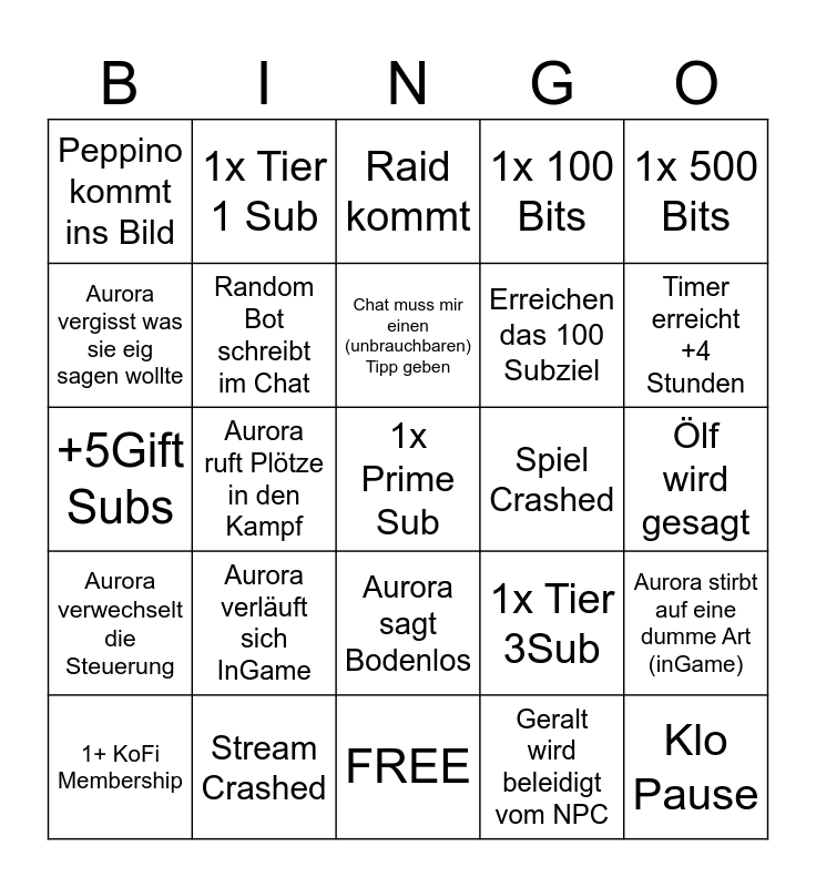 This bingo card has 25 words: Aurora verwechselt die Steuerung, Stream Crashed, 1x Prime Sub, Geralt wird beleidigt vom NPC, 1x 500 Bits, Peppino kommt ins Bild, 1x Tier 1 Sub, Raid kommt, Spiel Crashed, Aurora stirbt auf eine dumme Art (inGame), Aurora vergisst was sie eig sagen wollte, Random Bot schreibt im Chat, FREE, 1x Tier 3Sub, Timer erreicht +4 Stunden, 1+ KoFi Membership, Aurora ruft Plötze in den Kampf, Chat muss mir einen (unbrauchbaren) Tipp geben, Erreichen das 100 Subziel, Ölf wird gesagt, +5Gift Subs, Aurora verläuft sich InGame, Aurora sagt Bodenlos, 1x 100 Bits and Klo Pause.