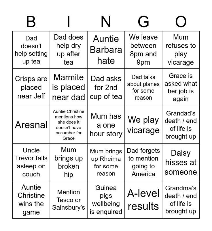 This bingo card has a free space and 24 words: Auntie Christine wins the game, Mum brings up broken hip, Dad asks for 2nd cup of tea, A-level results, Mum refuses to play vicarage, Dad doesn’t help setting up tea, Dad does help dry up after tea, Auntie Barbara hate, We play vicarage, Grandad’s death / end of life is brought up, Aresnal, Marmite is placed near dad, Dad forgets to mention going to America, Daisy hisses at someone, Crisps are placed near Jeff, Mention Tesco or Sainsbury’s, Guinea pigs wellbeing is enquired, We leave between 8pm and 9pm, Grace is asked what her job is again, Uncle Trevor falls asleep on couch, Auntie Christine mentions how she does it doesn’t have cucumber for Grace, Mum brings up Rheima for some reason, Dad talks about planes for some reason and Grandma’s death / end of life is brought up.