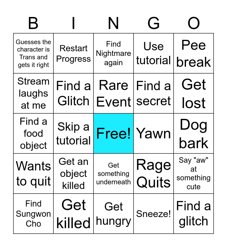 This bingo card has a free space and 24 words: Find Sungwon Cho, Get an object killed, Rare Event, Sneeze!, Pee break, Guesses the character is Trans and gets it right, Restart Progress, Find Nightmare again, Yawn, Dog bark, Find a food object, Find a Glitch, Rage Quits, Say "aw" at something cute, Stream laughs at me, Get killed, Get hungry, Use tutorial, Get lost, Wants to quit, Skip a tutorial, Get something underneath, Find a secret and Find a glitch.