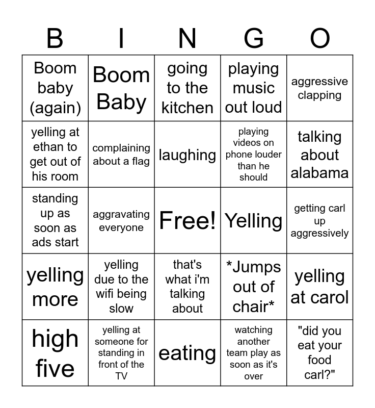 This bingo card has a free space and 24 words: yelling due to the wifi being slow, yelling at someone for standing in front of the TV, laughing, high five, aggressive clapping, Boom baby (again), yelling at ethan to get out of his room, Boom Baby, Yelling, that's what i'm talking about, playing videos on phone louder than he should, standing up as soon as ads start, *Jumps out of chair*, yelling at carol, complaining about a flag, watching another team play as soon as it's over, getting carl up aggressively, going to the kitchen, talking about alabama, aggravating everyone, "did you eat your food carl?", yelling more, playing music out loud and eating.