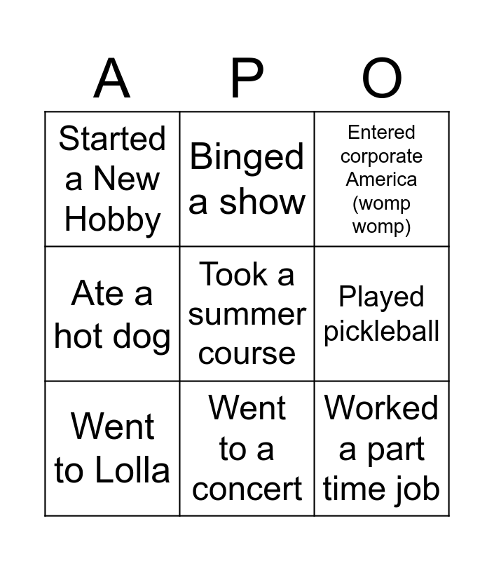 This bingo card has 18 words: Traveled outside of the country, Tried a new food, Entered corporate America (womp womp), Started a New Hobby, Went to the beach, Ate a hot dog, Saw fireworks, Binged a show, Went to a concert, Worked a part time job, Visited family, Took a summer course, Had a picnic, Played pickleball, Went to Lolla, Made smores, Watched The Summer I Turned Pretty and Went to the fair.