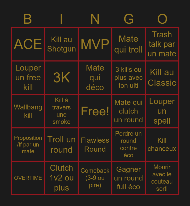 This bingo card has a free space and 24 words: Troll un round, Clutch 1v2 ou plus, Mate qui déco, OVERTIME, Trash talk par un mate, ACE, Louper un free kill, Kill au Shotgun, Mate qui clutch un round, Flawless Round, 3 kills ou plus avec ton ulti, Wallbang kill, Perdre un round contre éco, Kill chanceux, 3K, Gagner un round full éco, Louper un spell, MVP, Kill au Classic, Kill à travers une smoke, Mourir avec le couteau sorti, Proposition /ff par un mate, Mate qui troll and Comeback (3-9 ou pire).