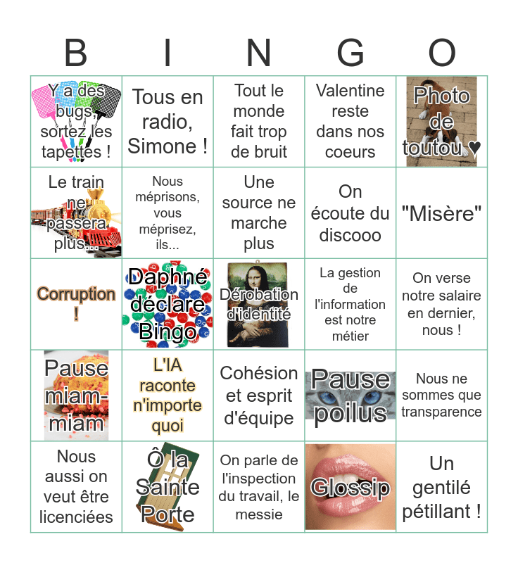 This bingo card has 12 images and 35 words: Pour la science !, Trouvé un nom atypique, Envie de meurtre, Nous méprisons, vous méprisez, ils..., Cohésion et esprit d'équipe, Valentine reste dans nos coeurs, Le train ne passera plus..., La Lou se plaint de pas avoir le temps, Une source ne marche plus, Pikachu sauvage apparaît !, Corruption !, Photo de toutou ♥, ♥, Cas flagrant de stupidité générale, Y a des bugs, sortez les tapettes !, La gestion de l'information est notre métier, Glossip, Daphné déclare Bingo, Pause miam-miam, Dérobation d'identité, Pause poilus, Nous aussi on veut être licenciées, Nous ne sommes que transparence, Ô la Sainte Porte, Tout le monde fait trop de bruit, "Misère", Un gentilé pétillant !, Nous attendons le jugement divin, On écoute du discooo, On verse notre salaire en dernier, nous !, Les profiteroles rêvent de pralulines, On parle de l'inspection du travail, le messie, L'IA raconte n'importe quoi, Tous en radio, Simone ! and Mais pourquoi les clients se désabonnent ?.