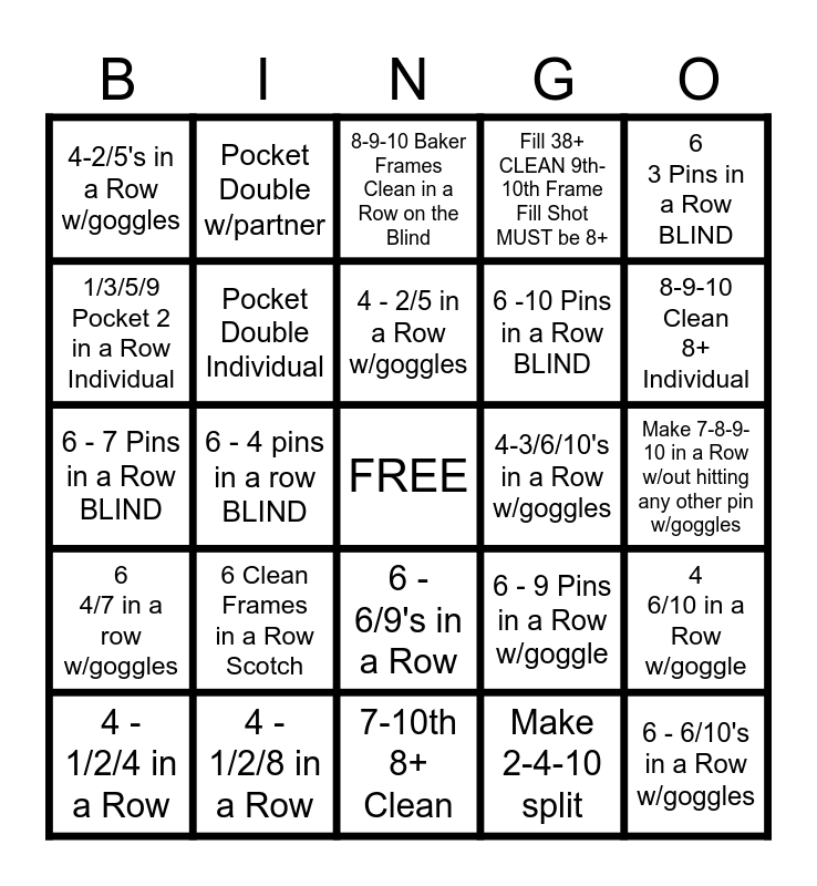 This bingo card has a free space and 24 words: 6 Clean Frames in a Row Scotch, 4 - 1/2/8 in a Row, 4 - 2/5 in a Row w/goggles, 4 - 1/2/4 in a Row, 6 3 Pins in a Row BLIND, 4-2/5's in a Row w/goggles, 1/3/5/9 Pocket 2 in a Row Individual, Pocket Double w/partner, 4-3/6/10's in a Row w/goggles, 6 - 6/9's in a Row, 6 -10 Pins in a Row BLIND, 6 - 7 Pins in a Row BLIND, 6 - 9 Pins in a Row w/goggle, 4 6/10 in a Row w/goggle, Pocket Double Individual, Make 2-4-10 split, Make 7-8-9-10 in a Row w/out hitting any other pin w/goggles, 8-9-10 Baker Frames Clean in a Row on the Blind, 8-9-10 Clean 8+ Individual, 6 - 4 pins in a row BLIND, 6 - 6/10's in a Row w/goggles, 6 4/7 in a row w/goggles, Fill 38+ CLEAN 9th-10th Frame Fill Shot MUST be 8+ and 7-10th 8+ Clean.