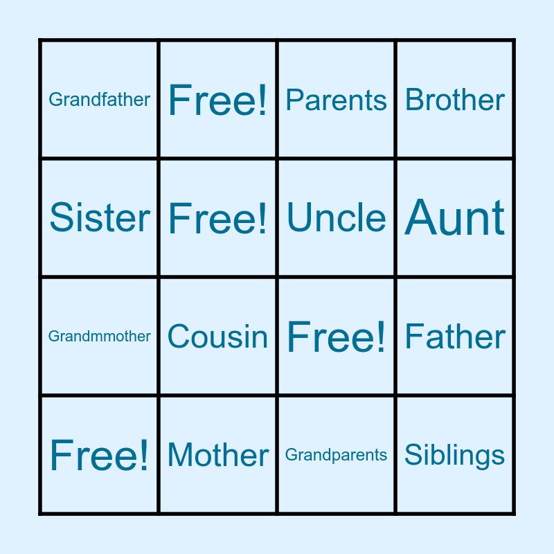This bingo card has 16 words: Mother, Father, Parents, Grandfather, Grandmmother, Free!, Free!, Grandparents, Sister, Free!, Free!, Brother, Cousin, Aunt, Uncle and Siblings.