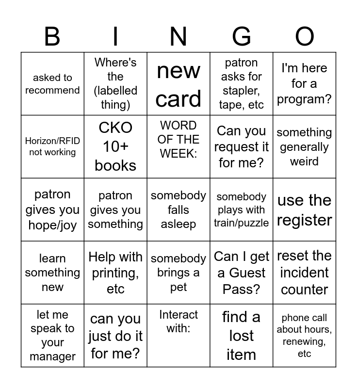 This bingo card has 25 words: Help with printing, etc, Interact with:, WORD OF THE WEEK:, let me speak to your manager, I'm here for a program?, asked to recommend, Horizon/RFID not working, Where's the (labelled thing), somebody plays with train/puzzle, somebody brings a pet, Can you request it for me?, patron gives you hope/joy, Can I get a Guest Pass?, reset the incident counter, CKO 10+ books, phone call about hours, renewing, etc, use the register, new card, something generally weird, patron gives you something, somebody falls asleep, can you just do it for me?, learn something new, patron asks for stapler, tape, etc and find a lost item.