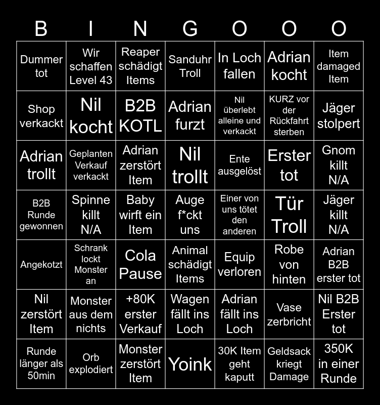 This bingo card has a free space and 48 words: Adrian fällt ins Loch, KURZ vor der Rückfahrt sterben, Yoink, Spinne killt N/A, Adrian zerstört Item, Jäger killt N/A, Wir schaffen Level 43, Orb explodiert, Adrian kocht, Animal schädigt Items, Item damaged Item, Sanduhr Troll, Erster tot, Ente ausgelöst, Nil zerstört Item, Tür Troll, Shop verkackt, Jäger stolpert, Vase zerbricht, In Loch fallen, Nil überlebt alleine und verkackt, Baby wirft ein Item, Dummer tot, Nil kocht, Nil B2B Erster tot, B2B KOTL, Gnom killt N/A, Runde länger als 50min, Nil trollt, Geplanten Verkauf verkackt, Geldsack kriegt Damage, Einer von uns tötet den anderen, Adrian B2B erster tot, Monster aus dem nichts, B2B Runde gewonnen, Equip verloren, Robe von hinten, Adrian trollt, Cola Pause, +80K erster Verkauf, Angekotzt, 350K in einer Runde, Reaper schädigt Items, Monster zerstört Item, Adrian furzt, Wagen fällt ins Loch, Schrank lockt Monster an and 30K Item geht kaputt.