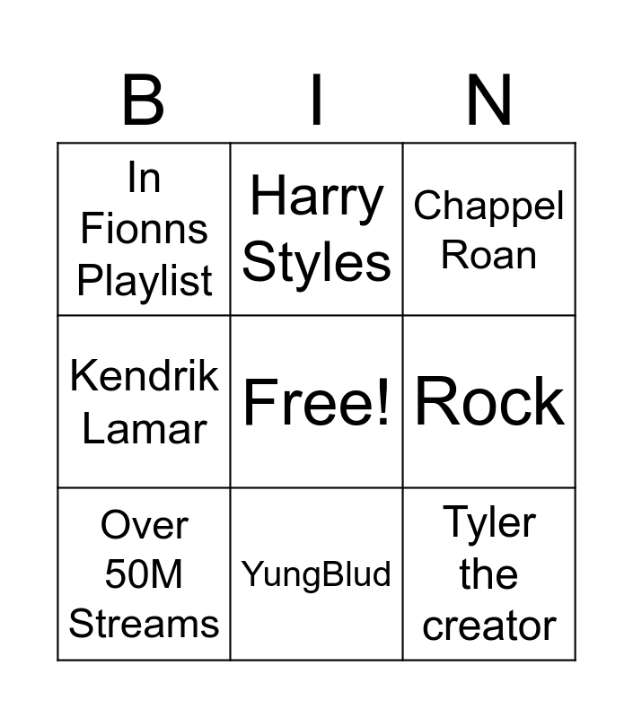 This bingo card has a free space and 8 words: Rock, Chappel Roan, Harry Styles, Over 50M Streams, In Fionns Playlist, Tyler the creator, Kendrik Lamar and YungBlud.
