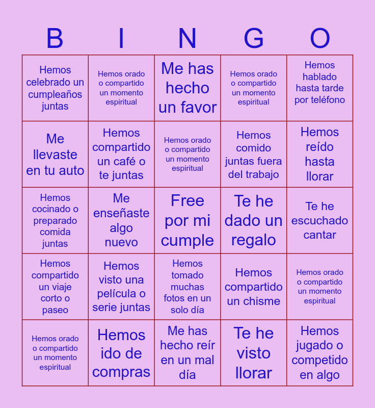 This bingo card has a free space and 29 words: Hemos orado o compartido un momento espiritual, Hemos sacado fotos juntas, Me enseñaste algo nuevo, Te he visto enojada, Hemos celebrado un cumpleaños juntas, Me has hecho un favor, Hemos compartido un café o te juntas, Hemos visto una película o serie juntas, Te he dado un regalo, Hemos ido de compras, Te he escuchado cantar, Hemos jugado o competido en algo, Me has hecho reír en un mal día, Te he visto llorar, Hemos reído hasta llorar, He bailado contigo, Hemos tomado muchas fotos en un solo día, Hemos compartido un viaje corto o paseo, Hemos hablado hasta tarde por teléfono, Hemos cocinado o preparado comida juntas, Hemos compartido un chisme, Hemos hablado de amor o parejas, Hemos comido juntas fuera del trabajo, Me llevaste en tu auto, Hemos orado o compartido un momento espiritual, Hemos orado o compartido un momento espiritual, Hemos orado o compartido un momento espiritual, Hemos orado o compartido un momento espiritual and Hemos orado o compartido un momento espiritual.