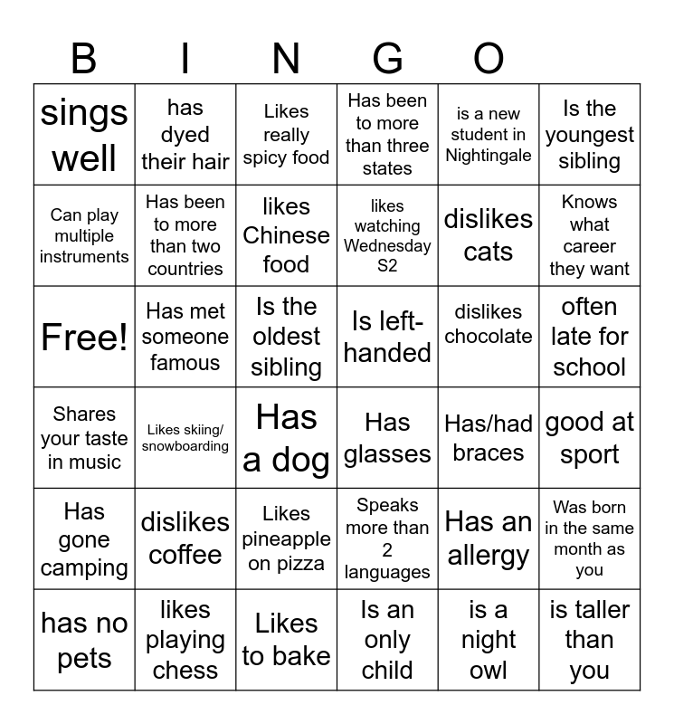 This bingo card has 36 words: Speaks more than 2 languages, Likes pineapple on pizza, Is an only child, Can play multiple instruments, Shares your taste in music, Is left-handed, Has been to more than two countries, Likes to bake, is a new student in Nightingale, Has an allergy, Knows what career they want, Has been to more than three states, Was born in the same month as you, Has met someone famous, likes watching Wednesday S2, sings well, Has gone camping, dislikes chocolate, Free!, Likes really spicy food, Is the oldest sibling, Likes skiing/ snowboarding, Has glasses, Has a dog, Has/had braces, has dyed their hair, dislikes cats, likes playing chess, likes Chinese food, Is the youngest sibling, is taller than you, has no pets, good at sport, often late for school, dislikes coffee and is a night owl.