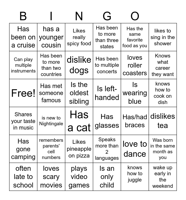 This bingo card has 36 words: Speaks more than 2 languages, Likes pineapple on pizza, Is an only child, Can play multiple instruments, Shares your taste in music, Is left-handed, Has been to more than two countries, plays video games, Has the same favorite food as you, love to dance, Knows what career they want, Has been to more than three states, Was born in the same month as you, Has met someone famous, Has been to multiple concerts, Has been on a cruise, Has gone camping, Is wearing blue, Free!, Likes really spicy food, Is the oldest sibling, is new to Nightingale, Has glasses, Has a cat, Has/had braces, has a younger cousin, loves roller coasters, loves scary movies, dislike dogs, likes to sing in the shower, wake up early in the weekend, often late to school, dislikes tea, knows how to cook on dish, remembers parents' cell numbers and knows how to juggle.