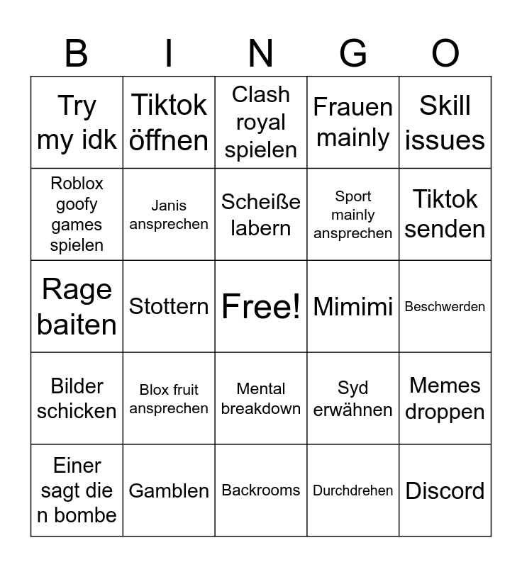 This bingo card has a free space and 24 words: Einer sagt die n bombe, Blox fruit ansprechen, Scheiße labern, Durchdrehen, Skill issues, Try my idk, Tiktok öffnen, Clash royal spielen, Mimimi, Beschwerden, Rage baiten, Janis ansprechen, Syd erwähnen, Memes droppen, Roblox goofy games spielen, Gamblen, Backrooms, Frauen mainly, Tiktok senden, Bilder schicken, Stottern, Mental breakdown, Sport mainly ansprechen and Discord.