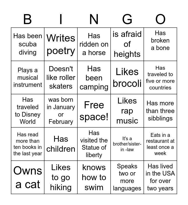 This bingo card has a free space and 24 words: Has children, Likes to go hiking, Has been camping, Owns a cat, Has broken a bone, Has been scuba diving, Plays a musical instrument, Writes poetry, Likes rap music, Has visited the Statue of liberty, Likes brocoli, Has traveled to Disney World, It's a brother/sister- in -law, Eats in a restaurant at least once a week, Doesn't like roller skaters, Speaks two or more languages, Has more than three sibblings, Has ridden on a horse, Has traveled to five or more countries, was born in January or February, Has lived in the USA for over two years, Has read more than ten books in the last year, is afraid of heights and knows how to swim.