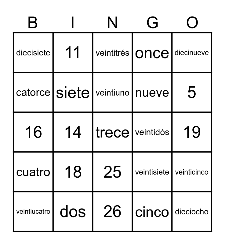 This bingo card has a free space and 59 words: uno, dos, tres, cuatro, cinco, seis, siete, ocho, nueve, diez, once, doce, catorce, quince, dieciséis, diecisiete, dieciocho, diecinueve, veinte, veintiuno, veintidós, veintitrés, veintiucatro, veinticinco, 1, 2, 3, 4, 5, 6, 7, 8, 9, 10, 11, 12, 13, 14, 15, 16, 17, 18, 19, 20, 21, 22, 23, 24, 25, 26, 27, 28, 29, 30, veintiséis, veintisiete, veintiocho, veintinueve and treinta.