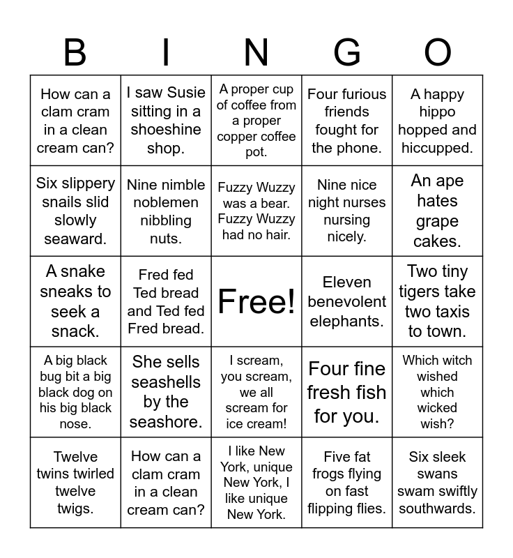 This bingo card has a free space and 24 words: She sells seashells by the seashore., How can a clam cram in a clean cream can?, Fuzzy Wuzzy was a bear. Fuzzy Wuzzy had no hair., Twelve twins twirled twelve twigs., A happy hippo hopped and hiccupped., How can a clam cram in a clean cream can?, Six slippery snails slid slowly seaward., I saw Susie sitting in a shoeshine shop., Eleven benevolent elephants., I scream, you scream, we all scream for ice cream!, Nine nice night nurses nursing nicely., A snake sneaks to seek a snack., Four fine fresh fish for you., Which witch wished which wicked wish?, Nine nimble noblemen nibbling nuts., Five fat frogs flying on fast flipping flies., Two tiny tigers take two taxis to town., A proper cup of coffee from a proper copper coffee pot., An ape hates grape cakes., Fred fed Ted bread and Ted fed Fred bread., Six sleek swans swam swiftly southwards., A big black bug bit a big black dog on his big black nose., Four furious friends fought for the phone. and I like New York, unique New York, I like unique New York..