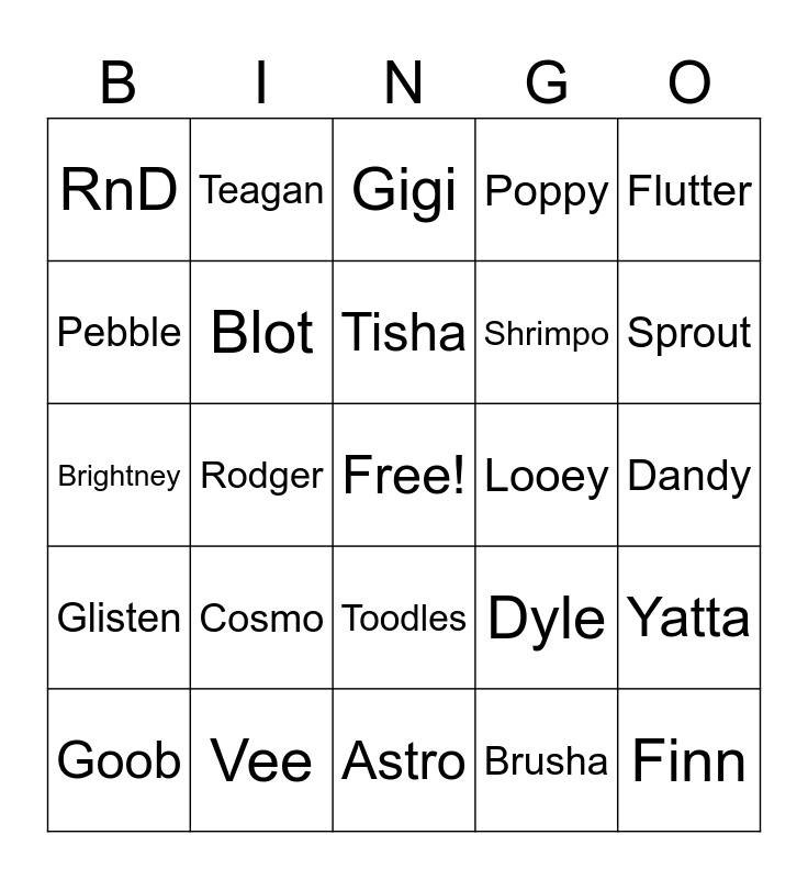 This bingo card has a free space and 28 words: Yatta, Boxten, Shrimpo, Brusha, Pebble, Gigi, Teagan, Glisten, Looey, Goob, Brightney, Poppy, Vee, Astro, Sprout, Shelly, Cosmo, Blot, Tisha, Toodles, RnD, Connie, Finn, Rodger, Dandy, Dyle, Flutter and Scraps.