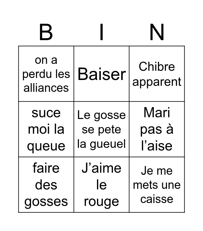 This bingo card has a free space and 8 words: Mari pas à l’aise, Chibre apparent, Baiser, faire des gosses, on a perdu les alliances, Je me mets une caisse, suce moi la queue and J’aime le rouge.