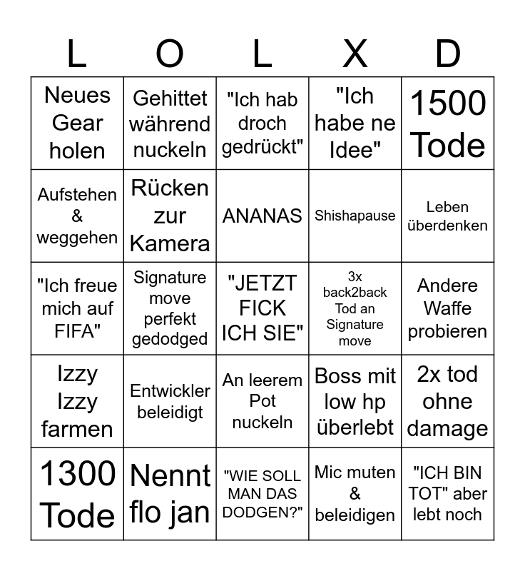 This bingo card has a free space and 24 words: Entwickler beleidigt, Nennt flo jan, ANANAS, 1300 Tode, 1500 Tode, Neues Gear holen, Aufstehen & weggehen, Gehittet während nuckeln, 3x back2back Tod an Signature move, An leerem Pot nuckeln, Shishapause, "Ich freue mich auf FIFA", Boss mit low hp überlebt, 2x tod ohne damage, Rücken zur Kamera, Mic muten & beleidigen, Andere Waffe probieren, "Ich hab droch gedrückt", Leben überdenken, Signature move perfekt gedodged, "ICH BIN TOT" aber lebt noch, Izzy Izzy farmen, "Ich habe ne Idee" and "WIE SOLL MAN DAS DODGEN?".
