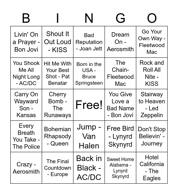 This bingo card has a free space and 29 words: Crazy - Aerosmith, I Love Rock N' Roll - Joan Jett, Cherry Bomb - The Runaways, Any Way You Want It - Journey, Livin' On a Prayer - Bon Jovi, Bad Reputation - Joan Jett, Hit Me With Your Best Shot - Pat Benatar, Bohemian Rhapsody - Queen, You Give Love a Bad Name - Bon Jovi, The Final Countdown - Europe, Stairway to Heaven - Led Zeppelin, Hotel California - The Eagles, Back in Black - AC/DC, Sweet Home Alabama - Lynyrd Skynyrd, Rock and Roll All Nite - KISS, You Really Got Me - The Kinks, Jump - Van Halen, Every Breath You Take - The Police, Go Your Own Way - Fleetwood Mac, Carry On Wayward Son - Kansas, Free Bird - Lynyrd Skynyrd, Somebody to Love - Queen, The Chain- Fleetwood Mac, You Shook Me All Night Long - AC/DC, Dream On - Aerosmith, Shout It Out Loud - KISS, Don't Stop Believin' - Journey, Born in the USA - Bruce Springsteen and Come Together - The Beatles.