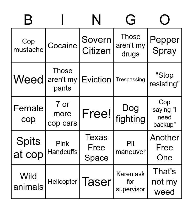 This bingo card has a free space and 49 words: Foot Chase, That's not my weed, DUI/DWI, Taser, Pink Handcuffs, Meth, Cocaine, Crack, Weed, Booze/Beer, Those aren't my pants, Those aren't my drugs, Another Free One, Pit maneuver, Car Crash, Getting car Towed, Eviction, Dog fighting, Chased by police dog, Pepper Spray, 7 or more cop cars, Karen ask for supervisor, Cop mustache, Trespassing, Karen calls cops, "Stop resisting", Wild animals, Florida Free Space, Texas Free Space, Spits at cop, Kicks inside cop car, Field sobriety test, Runs stoplight, Spike strip, Helicopter, No shoes, Someone gets or is nekid, Asks "Am I going to jail?", Cop saying "I need backup", Motorcycle cop, Fat cop, Cop with beard, Kick in door, Battering Ram, Female cop, Sovern Citizen, Swat gets involved, Shoot out and Underage/ Minor.