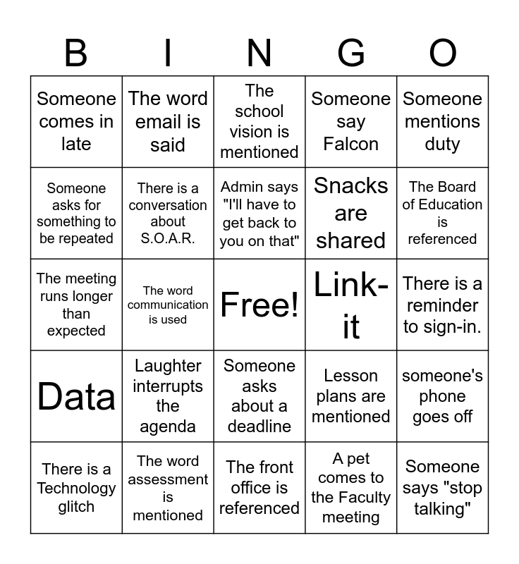 This bingo card has a free space and 24 words: Laughter interrupts the agenda, The word assessment is mentioned, Admin says "I'll have to get back to you on that", There is a Technology glitch, Someone mentions duty, Someone comes in late, Someone asks for something to be repeated, The word email is said, Link-it, Someone asks about a deadline, Snacks are shared, The meeting runs longer than expected, Lesson plans are mentioned, someone's phone goes off, There is a conversation about S.O.A.R., A pet comes to the Faculty meeting, There is a reminder to sign-in., The school vision is mentioned, The Board of Education is referenced, The word communication is used, Someone says "stop talking", Data, Someone say Falcon and The front office is referenced.
