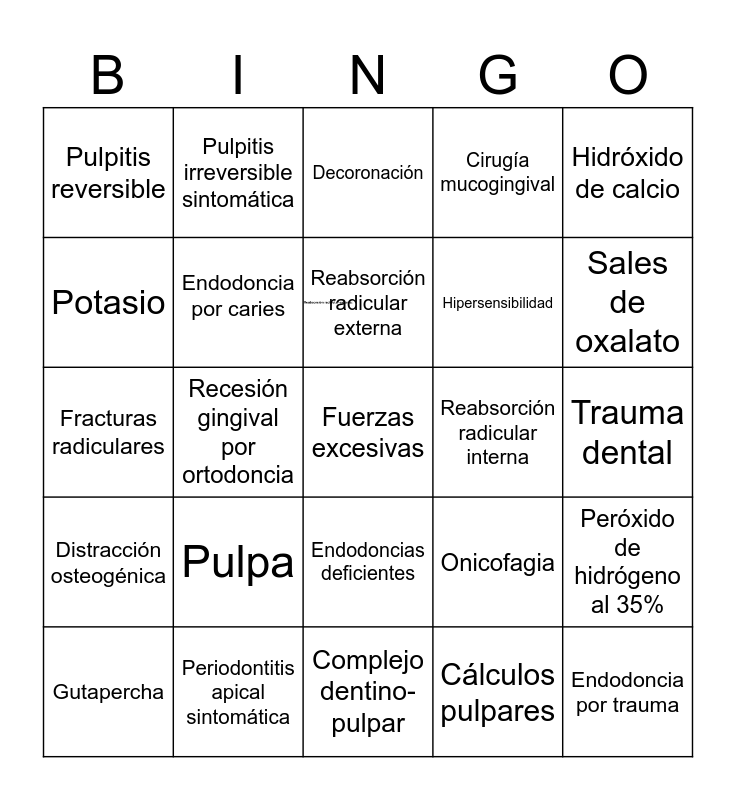This bingo card has 1 images and 25 words: Pulpa, Complejo dentino-pulpar, Reabsorción radicular externa, Gutapercha, Hidróxido de calcio, Pulpitis reversible, Potasio, Pulpitis irreversible sintomática, Reabsorción radicular interna, Endodoncias deficientes, Hipersensibilidad, Fracturas radiculares, Onicofagia, Peróxido de hidrógeno al 35%, Endodoncia por caries, Endodoncia por trauma, Trauma dental, Decoronación, Sales de oxalato, Recesión gingival por ortodoncia, Fuerzas excesivas, Periodontitis apical sintomática, Distracción osteogénica, Cirugía mucogingival and Cálculos pulpares.