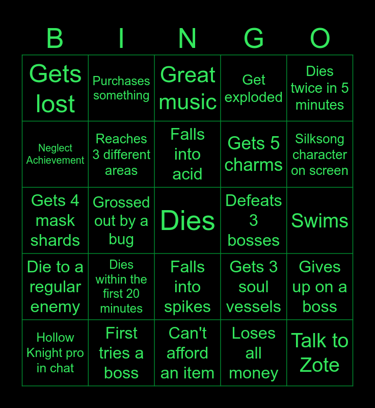 This bingo card has a free space and 24 words: Dies within the first 20 minutes, First tries a boss, Falls into acid, Hollow Knight pro in chat, Dies twice in 5 minutes, Gets lost, Neglect Achievement, Purchases something, Defeats 3 bosses, Falls into spikes, Gets 5 charms, Gets 4 mask shards, Gets 3 soul vessels, Gives up on a boss, Reaches 3 different areas, Loses all money, Swims, Great music, Silksong character on screen, Grossed out by a bug, Talk to Zote, Die to a regular enemy, Get exploded and Can't afford an item.