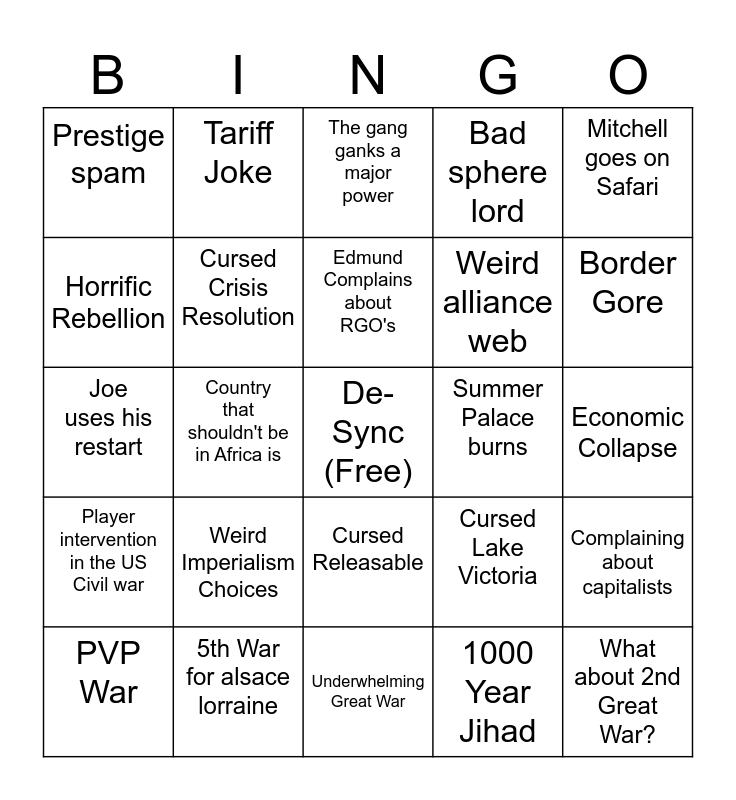 This bingo card has a free space and 33 words: Death War, Coalition to save a player, Country that shouldn't be in Africa is, Cursed Treaty port, Player intervention in the US Civil war, Cursed Crisis Resolution, Mitchell goes on Safari, PVP War, Tariff Joke, Someone gets their king killed, Edmund Complains about RGO's, The gang ganks a major power, Call to arms from both sides, Funny News paper article, Summer Palace burns, Border Gore, 5th War for alsace lorraine, Joe uses his restart, Weird Imperialism Choices, Cursed Lake Victoria, Cursed Releasable, Someone says something questionable, Prestige spam, Economic Collapse, Underwhelming Great War, What about 2nd Great War?, Bad sphere lord, Weird alliance web, Horrific Rebellion, Complaining about capitalists, Dylan has a great session, 1000 Year Jihad and "I'm going fascist".