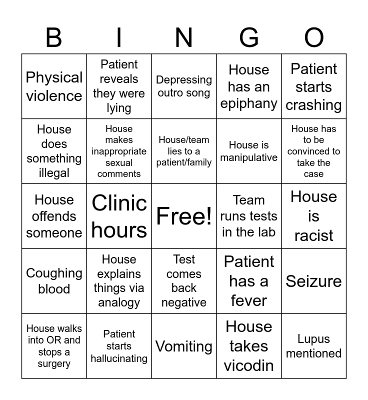 This bingo card has a free space and 32 words: House takes vicodin, Inside body animation, Clinic hours, Searching the patient’s home, Coughing blood, House makes inappropriate sexual comments, Patient starts crashing, Seizure, Patient reveals they were lying, Respiratory distress/intubation, House/team lies to a patient/family, Depressing outro song, Patient gets a scan, Patient gets a procedure, Team runs tests in the lab, Dubious ethics, House walks into OR and stops a surgery, House offends someone, Test comes back negative, House explains things via analogy, Patient has a fever, House accuses someone of lying, House is racist, Patient starts hallucinating, Lupus mentioned, House has an epiphany, House is manipulative, House does something illegal, Physical violence, Vomiting, Cameron can’t give bad news and House has to be convinced to take the case.