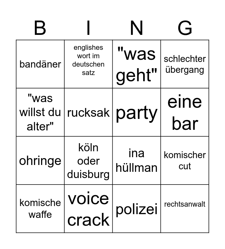 This bingo card has 16 words: voice crack, komischer cut, "was geht", bandäner, ohringe, englishes wort im deutschen satz, ina hüllman, polizei, "was willst du alter", rucksak, komische waffe, schlechter übergang, köln oder duisburg, eine bar, party and rechtsanwalt.