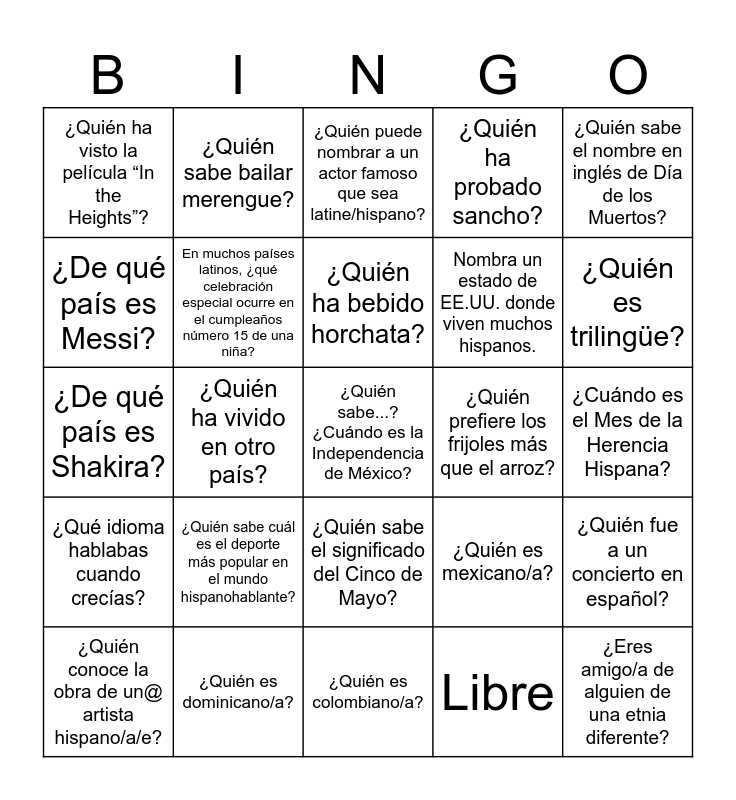 This bingo card has 30 words: ¿Quién es dominicano/a?, ¿Quién sabe bailar bachata?, ¿Quién ha vivido en otro país?, ¿Quién es ecuatoriano/a?, ¿Quién ha visto la película “In the Heights”?, ¿Quién puede nombrar a un actor famoso que sea latine/hispano?, En muchos países latinos, ¿qué celebración especial ocurre en el cumpleaños número 15 de una niña?, ¿Quién sabe el significado del Cinco de Mayo?, ¿Quién prefiere los frijoles más que el arroz?, ¿Quién es colombiano/a?, ¿Cuándo es el Mes de la Herencia Hispana?, ¿Quién sabe...?¿Cuándo es la Independencia de México?, Libre, ¿Eres amigo/a de alguien de una etnia diferente?, ¿Quién es trilingüe?, ¿Quién es puertorriqueño/a?, ¿Quién es mexicano/a?, ¿Qué idioma hablabas cuando crecías?, ¿Quién sabe cuál es el deporte más popular en el mundo hispanohablante?, ¿Quién sabe el nombre en inglés de Día de los Muertos?, ¿De qué país es Shakira?, ¿Qué país es famoso por el tango?, ¿Quién sabe bailar merengue?, Nombra un estado de EE.UU. donde viven muchos hispanos., ¿De qué país es Messi?, ¿Quién ha probado sancho?, ¿Quién fue a un concierto en español?, ¿Quién conoce la obra de un@ artista hispano/a/e?, ¿Quién ha bebido horchata? and ¿Quién tiene familia en un país hispanohablante?.