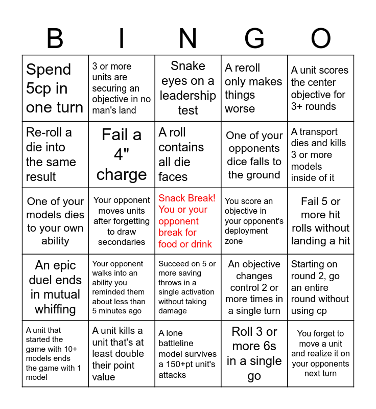 This bingo card has a free space and 24 words: Your opponent walks into an ability you reminded them about less than 5 minutes ago, A unit kills a unit that's at least double their point value, A roll contains all die faces, A unit that started the game with 10+ models ends the game with 1 model, A unit scores the center objective for 3+ rounds, Spend 5cp in one turn, Re-roll a die into the same result, 3 or more units are securing an objective in no man's land, You score an objective in your opponent's deployment zone, Succeed on 5 or more saving throws in a single activation without taking damage, One of your opponents dice falls to the ground, One of your models dies to your own ability, An objective changes control 2 or more times in a single turn, Starting on round 2, go an entire round without using cp, Fail a 4" charge, Roll 3 or more 6s in a single go, Fail 5 or more hit rolls without landing a hit, Snake eyes on a leadership test, A transport dies and kills 3 or more models inside of it, Your opponent moves units after forgetting to draw secondaries, You forget to move a unit and realize it on your opponents next turn, An epic duel ends in mutual whiffing, A reroll only makes things worse and A lone battleline model survives a 150+pt unit's attacks.