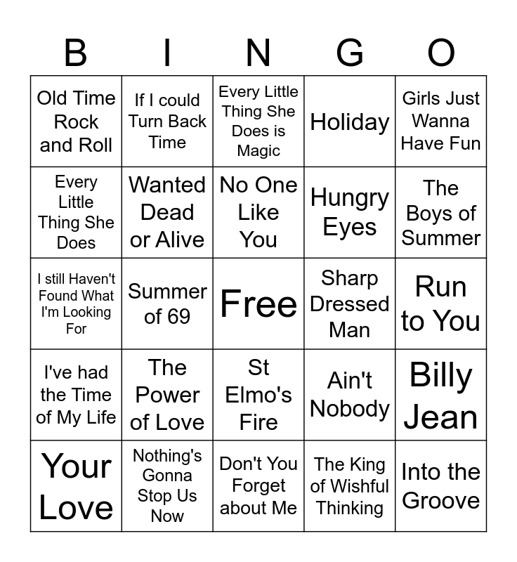 This bingo card has a free space and 29 words: Your Love, You shook me all Night Long, Summer of 69, You Give Love a Bad Name, Old Time Rock and Roll, Every Little Thing She Does is Magic, Wanted Dead or Alive, The Power of Love, Sharp Dressed Man, Nothing's Gonna Stop Us Now, Run to You, Into the Groove, Don't You Forget about Me, The King of Wishful Thinking, The Boys of Summer, Danger Zone, St Elmo's Fire, I've had the Time of My Life, Girls Just Wanna Have Fun, I still Haven't Found What I'm Looking For, Ain't Nobody, Missing You, Hungry Eyes, Every Little Thing She Does, Holiday, If I could Turn Back Time, Billy Jean, No One Like You and Time After Time.
