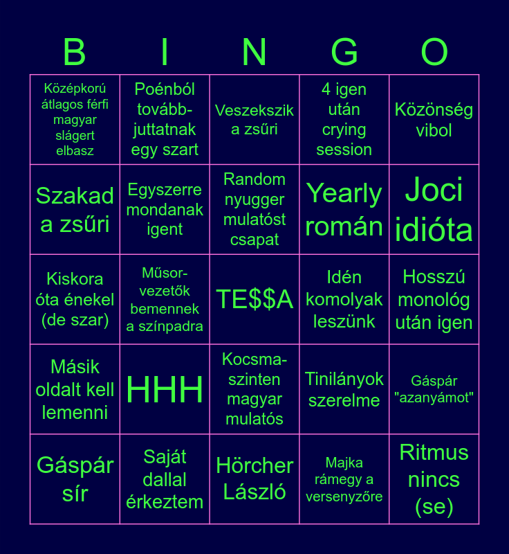 This bingo card has 25 words: HHH, Hörcher László, Random nyugger mulatóst csapat, Gáspár sír, Közönség vibol, Középkorú átlagos férfi magyar slágert elbasz, Szakad a zsűri, Poénból tovább-juttatnak egy szart, Idén komolyak leszünk, Kocsma-szinten magyar mulatós, Yearly román, Kiskora óta énekel (de szar), Tinilányok szerelme, Gáspár "azanyámot", Egyszerre mondanak igent, Ritmus nincs (se), Hosszú monológ után igen, Veszekszik a zsűri, Joci idióta, Műsor-vezetők bemennek a színpadra, TE$$A, Saját dallal érkeztem, Másik oldalt kell lemenni, 4 igen után crying session and Majka rámegy a versenyzőre.